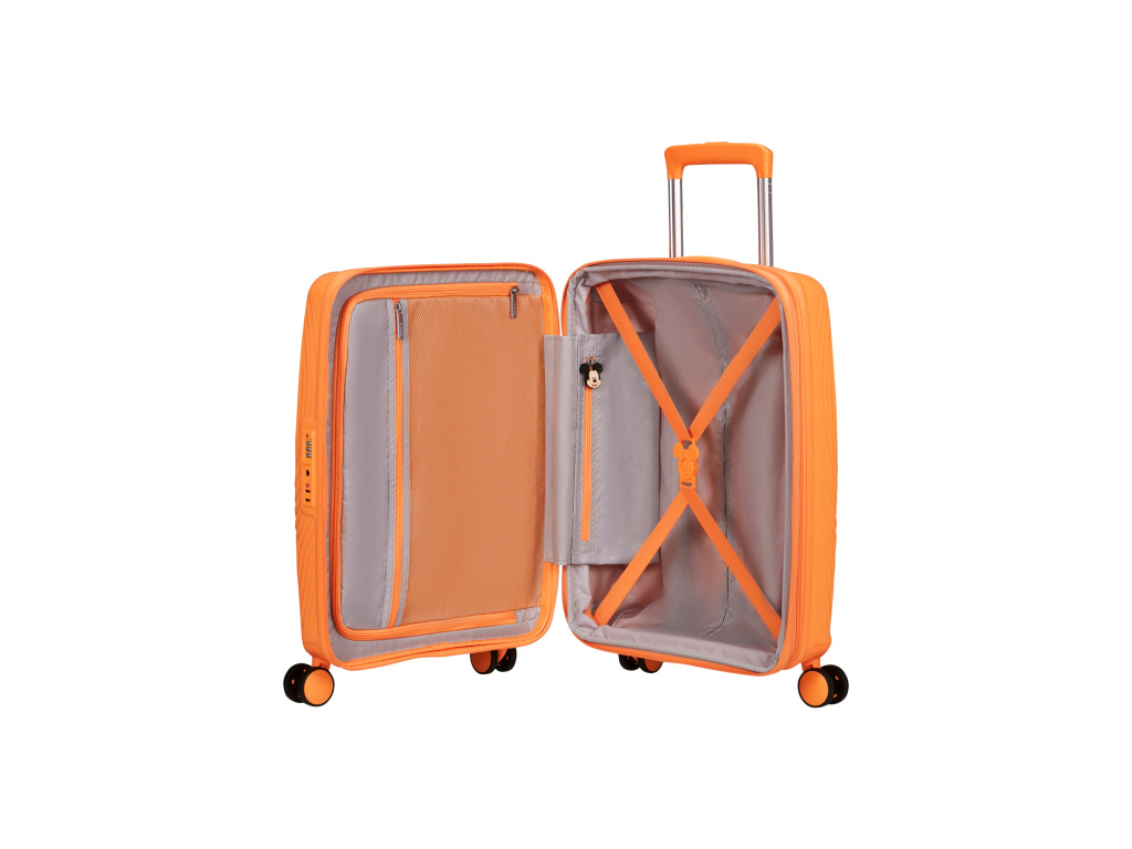 Řada Mickey Magic nabízí prakticky řešený interiér s fixačními popruhy a kapsami pro přehledné uložení věcí, možnost rozšíření objemu pro větší flexibilitu při balení a integrovaný TSA zámek, který je vhodný i pro leteckou dopravu. Čtyři otočná kolečka zajišťují plynulý pohyb a pohodlnou manipulaci během cest.