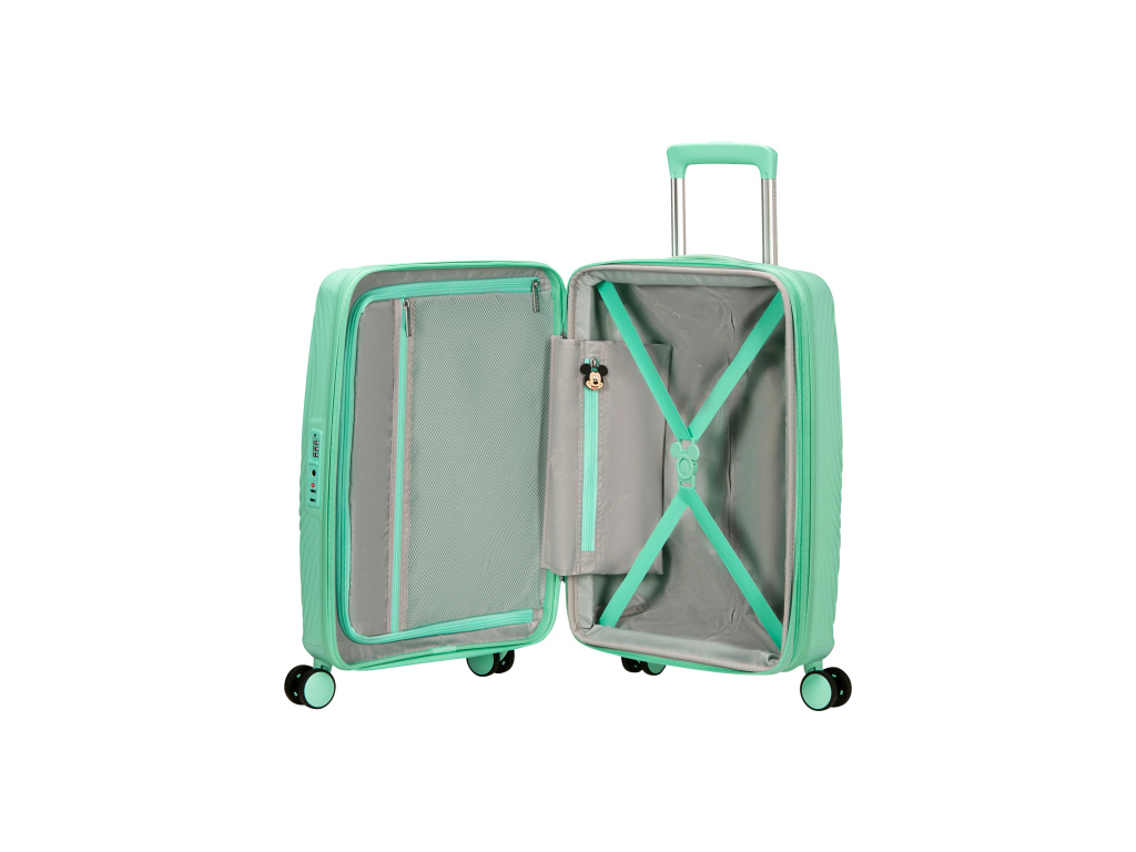 Řada Mickey Magic nabízí prakticky řešený interiér s fixačními popruhy a kapsami pro přehledné uložení věcí, možnost rozšíření objemu pro větší flexibilitu při balení a integrovaný TSA zámek, který je vhodný i pro leteckou dopravu. Čtyři otočná kolečka zajišťují plynulý pohyb a pohodlnou manipulaci během cest.