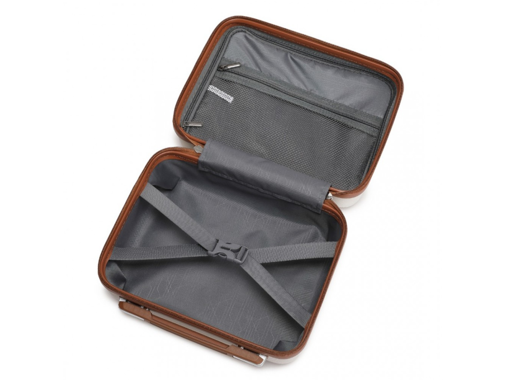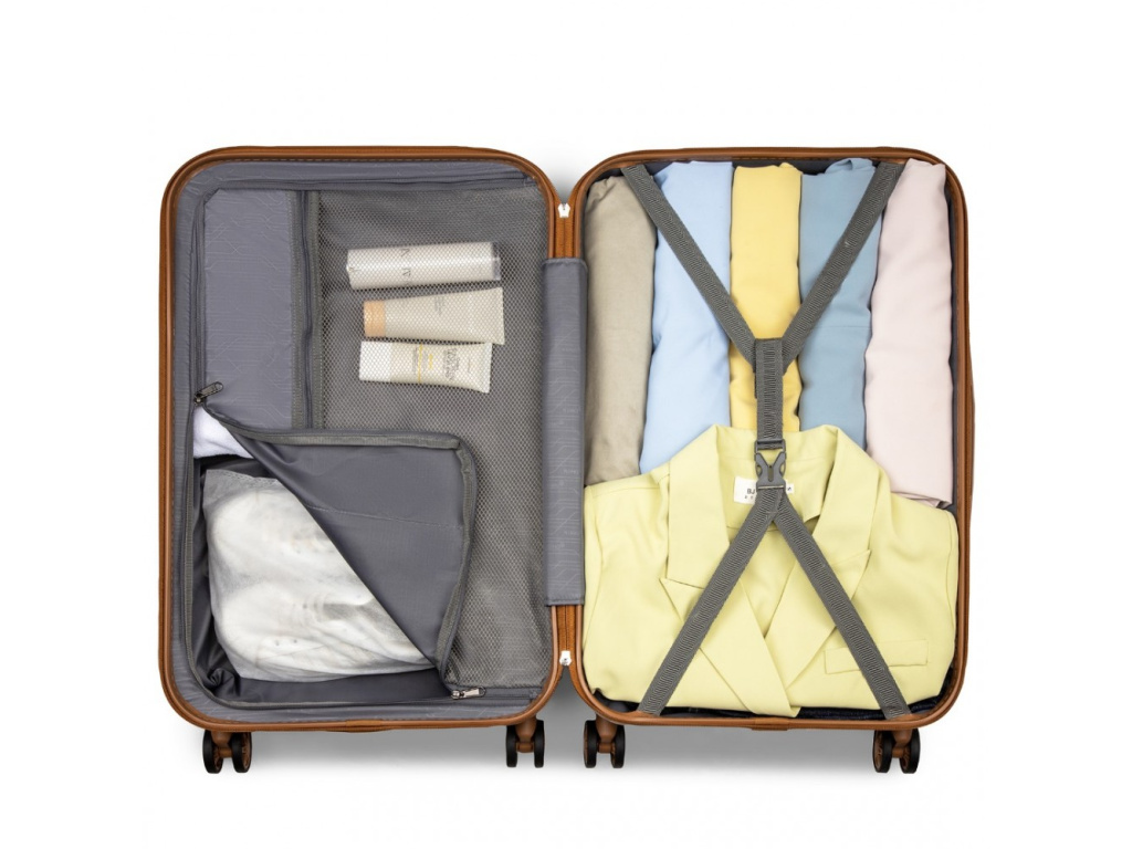 - Pružné křížové popruhy pro upevnění obsahu na jedné straně a zipem zavíraná přihrádka na druhé straně kufru