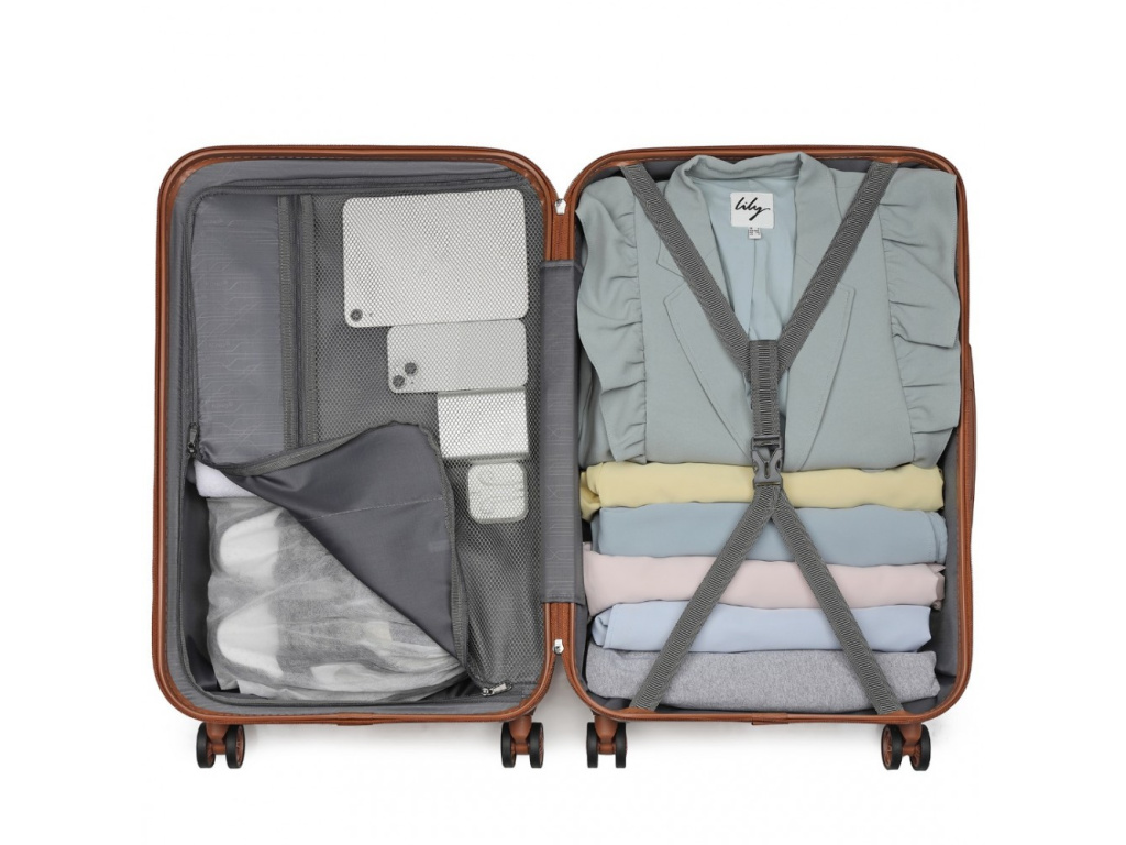 - Pružné křížové popruhy pro upevnění obsahu na jedné straně a zipem zavíraná přihrádka na druhé straně kufru