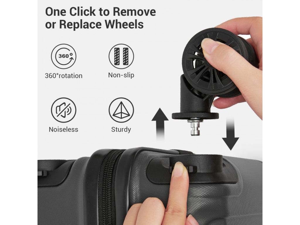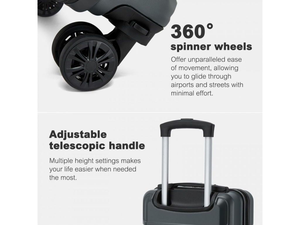 Kufr je vyroben z ABS a polykarbonátu, díky čemuž je lehký, odolný a spolehlivě chrání obsah zavazadla. Pohodlnou manipulaci zajišťují tichá dvojitá kolečka, která lze vyjmout, což umožňuje zmenšit velikost kufru podle potřeby, například kvůli omezením leteckých společností. Bezpečnost zajišťuje TSA číselný zámek, pohodlné ovládání pak teleskopické vysouvací madlo. Materiál ABS je odolný proti poškrábání a snáší nízké teploty; není tak pružný jako polypropylen, ale pro občasné cesty je plně dostačující.