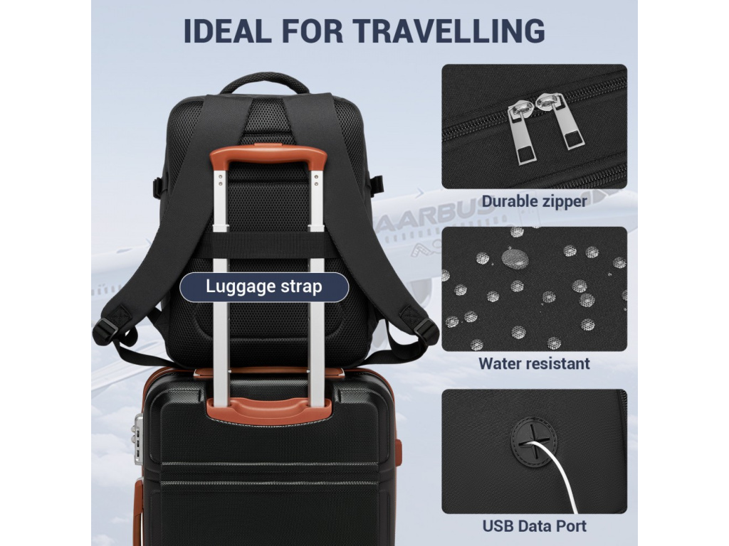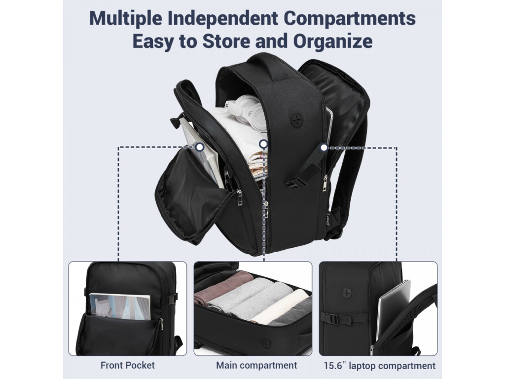 Praktický a přehledně řešený batoh vhodný jako příruční zavazadlo do letadla i pro každodenní použití. Hlavní prostor se otevírá po celém obvodu pro snadné balení, nechybí samostatná polstrovaná kapsa na notebook do velikosti 15,6" a řada menších přihrádek na dokumenty a drobnosti. Odolný materiál pomáhá chránit obsah před vlhkostí a opotřebením, zatímco měkce polstrované popruhy a zádová část zajišťují pohodlné nošení i při delším cestování. Ideální volba do práce, školy i na krátké výlety.