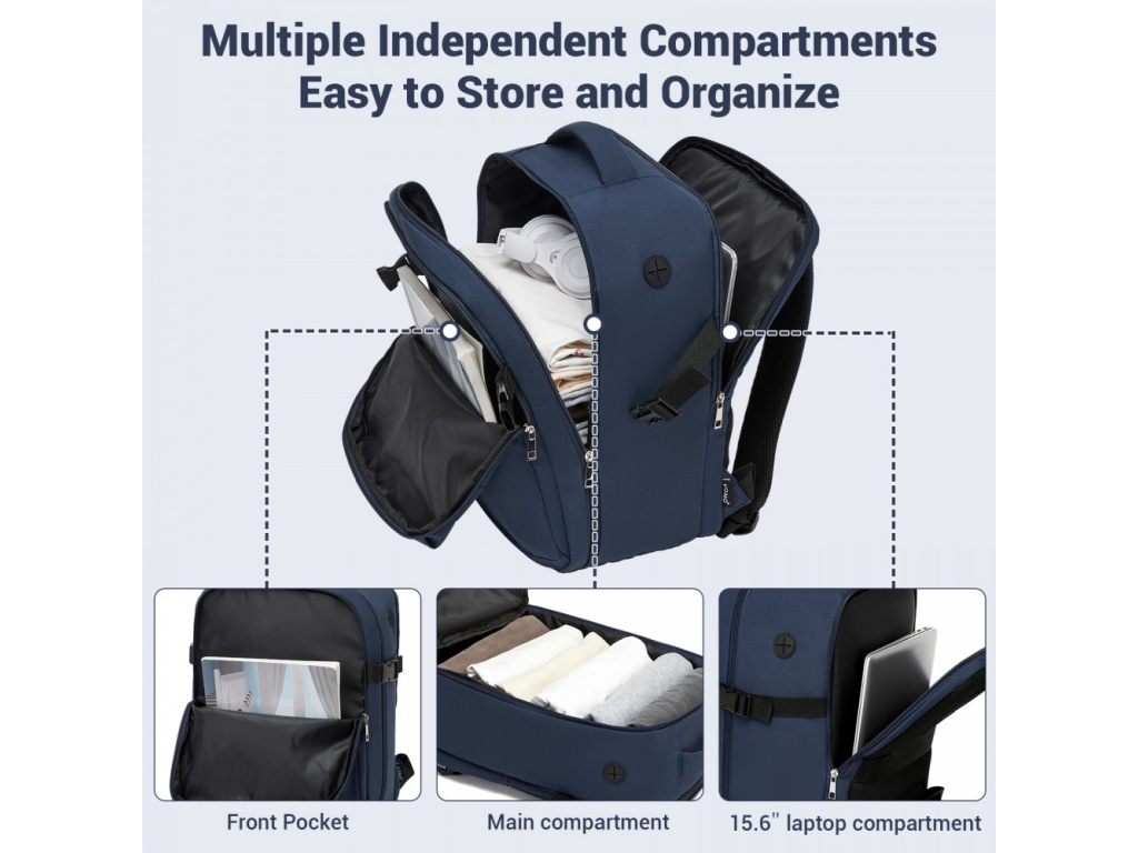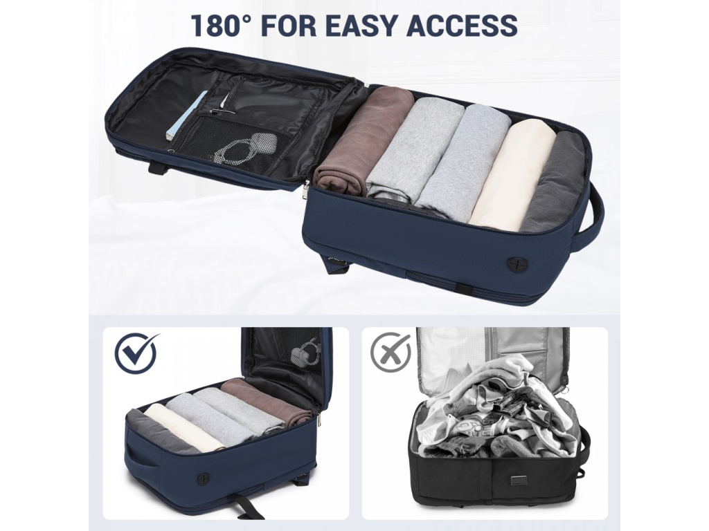 Praktický a přehledně řešený batoh vhodný jako příruční zavazadlo do letadla i pro každodenní použití. Hlavní prostor se otevírá po celém obvodu pro snadné balení, nechybí samostatná polstrovaná kapsa na notebook do velikosti 15,6" a řada menších přihrádek na dokumenty a drobnosti. Odolný materiál pomáhá chránit obsah před vlhkostí a opotřebením, zatímco měkce polstrované popruhy a zádová část zajišťují pohodlné nošení i při delším cestování. Ideální volba do práce, školy i na krátké výlety.