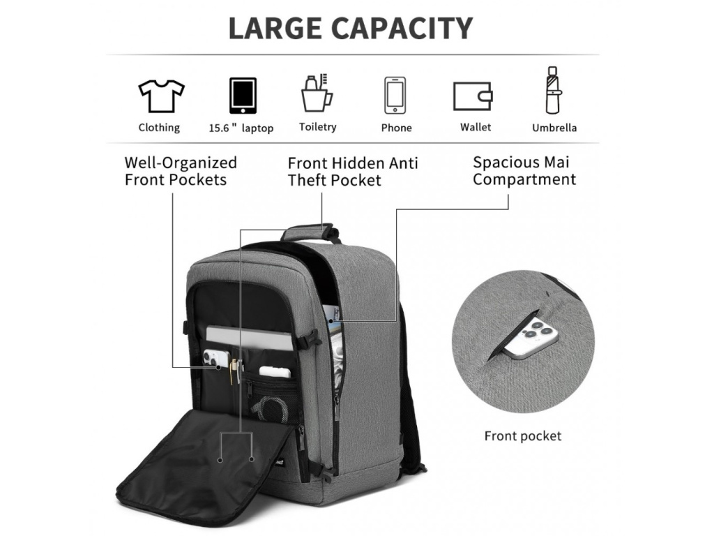 Batoh pro pohodlné přenášení notebooku velikosti 15,6" vyroben z polyesteru. Hlavní kapsa batohu se dá rozevřít jako malý kufr a lze tak pohodlně uložit oděvy pro cestování. V hlavním oddíle je polstrovaná přihrádka na notebook a další oddíl na tablet.