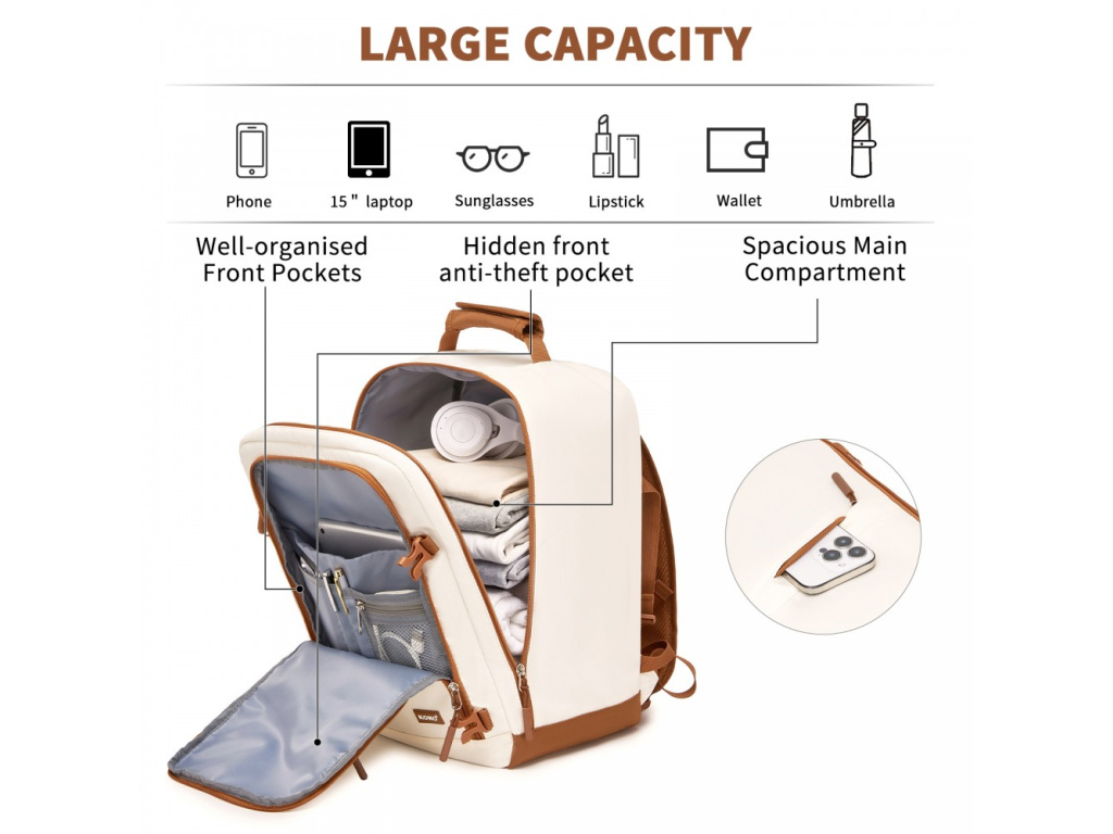 Ideální společník na cestování i každodenní dojíždění. Batoh splňuje standardní rozměry 40 × 30 × 20 cm pro příruční zavazadlo u většiny leteckých společností. Díky promyšlenému vnitřnímu uspořádání a samostatným kapsám udržíte přehled o notebooku, dokumentech i drobných nezbytnostech. Hlavní prostor se otevírá jako kufr, což výrazně usnadňuje balení i vyndávání věcí.