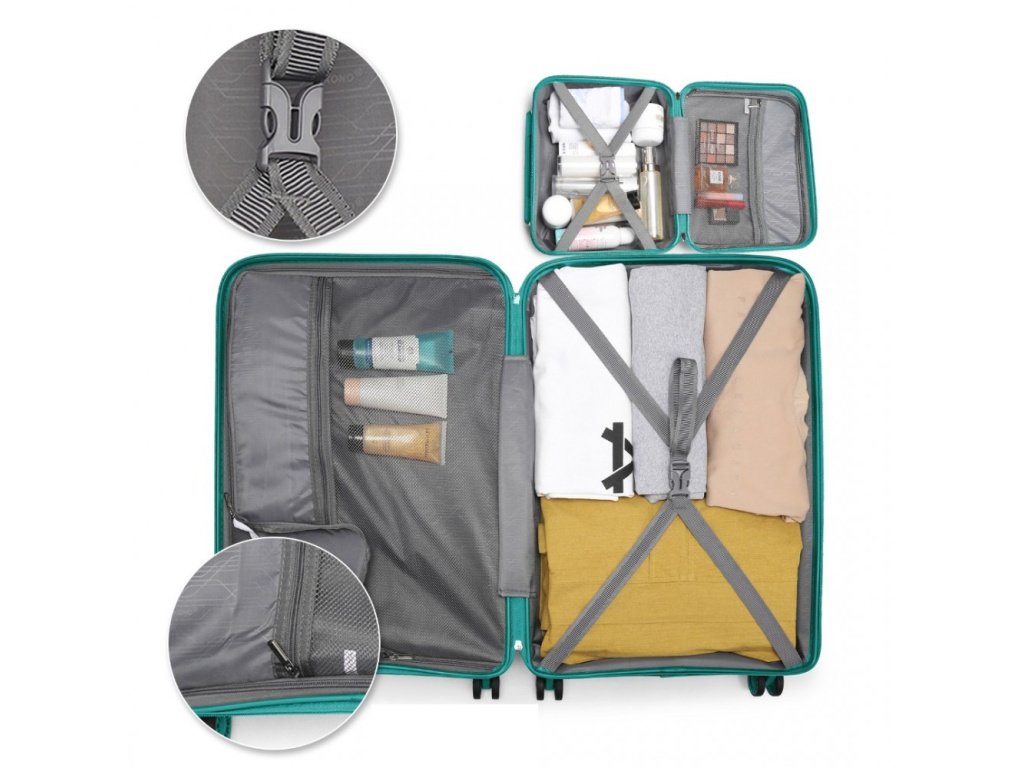 - Nylonové křížové popruhy pro upevnění obsahu na jedné straně a zipem zavíraná přihrádka na druhé straně kufru