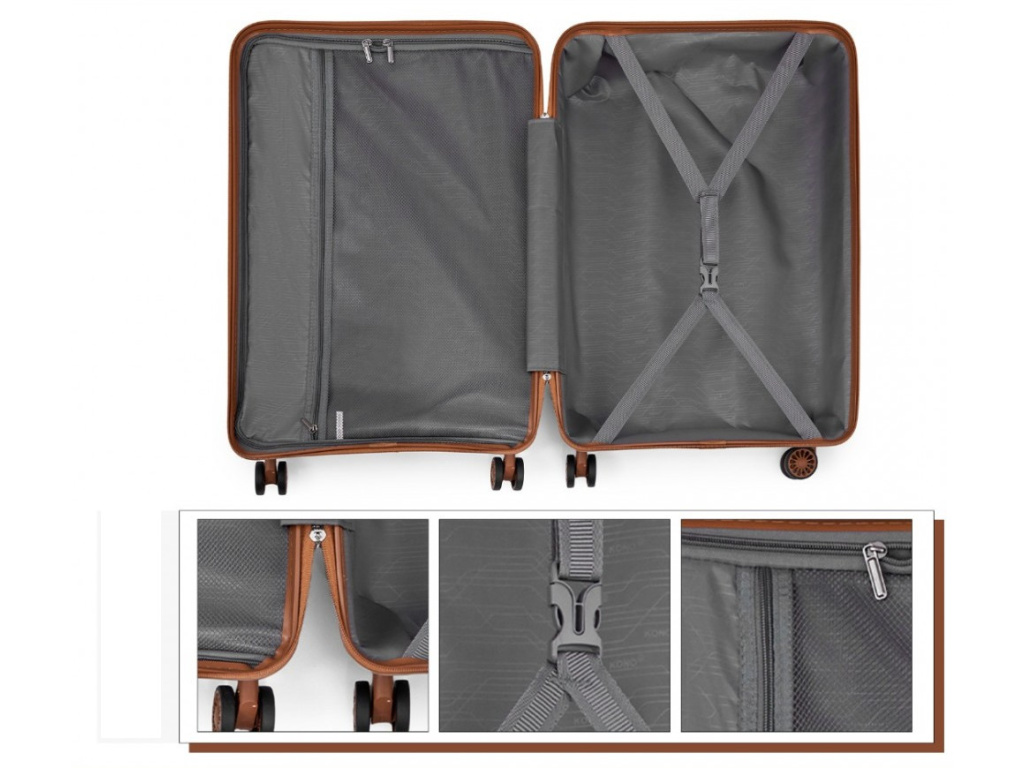 - Nylonové křížové popruhy pro upevnění obsahu na jedné straně a zipem zavíraná přihrádka na druhé straně kufru