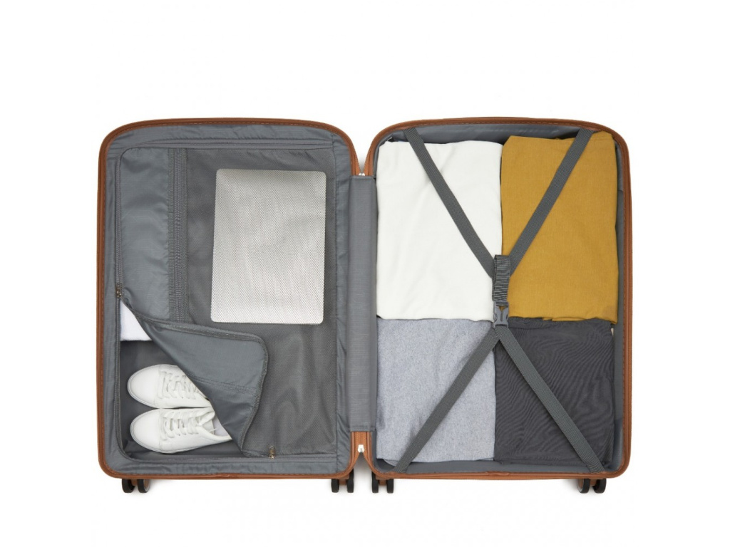 - Nylonové křížové popruhy pro upevnění obsahu na jedné straně a zipem zavíraná přihrádka na druhé straně kufru