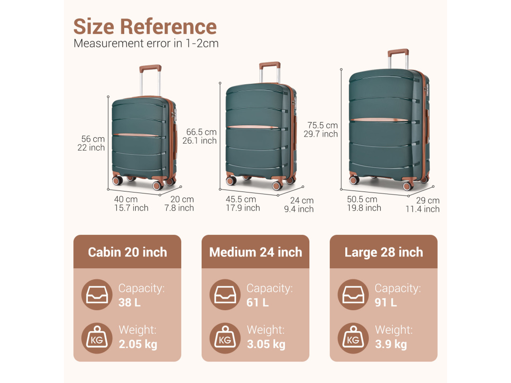 Sada obsahuje 3 kufry rozěmrů S, M a L pro cestování s různými potřebami a délkami. Kabinový S kufr na víkendové nebo lehčí týdenní cesty. Střední M kufr na týdenní cesty a L kufr i na dvoutýdenní dovolené.