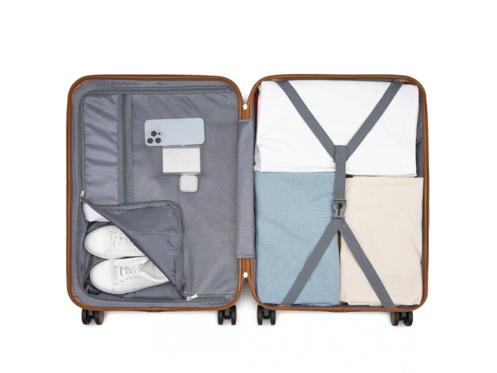 - Nylonové křížové popruhy pro upevnění obsahu na jedné straně a zipem zavíraná přihrádka na druhé straně kufru