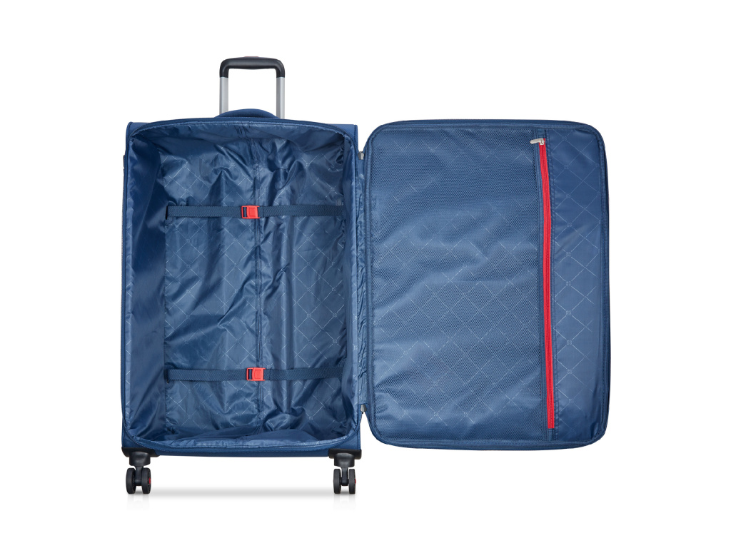 Vnitřek kufru je vybaven stahovacími popruhy a velkou kapsou na zip.