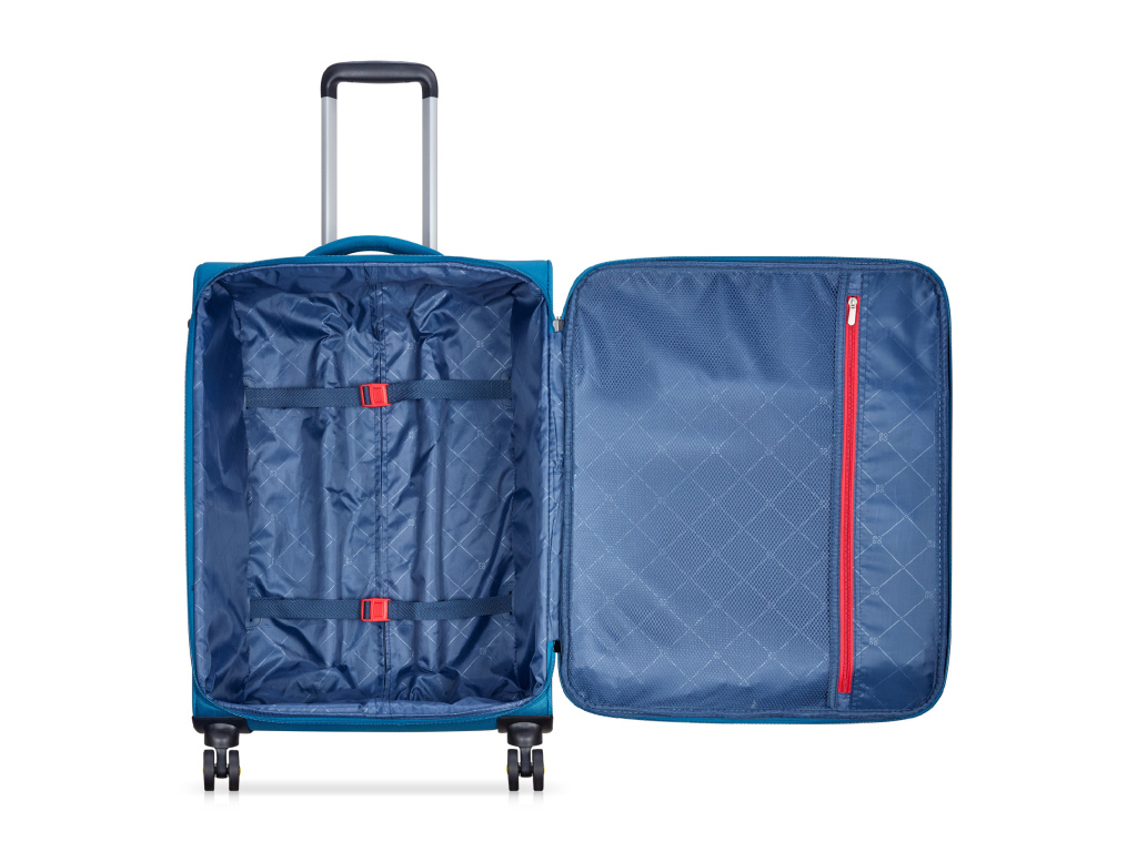 Vnitřek kufru je vybaven stahovacími popruhy a velkou kapsou na zip.