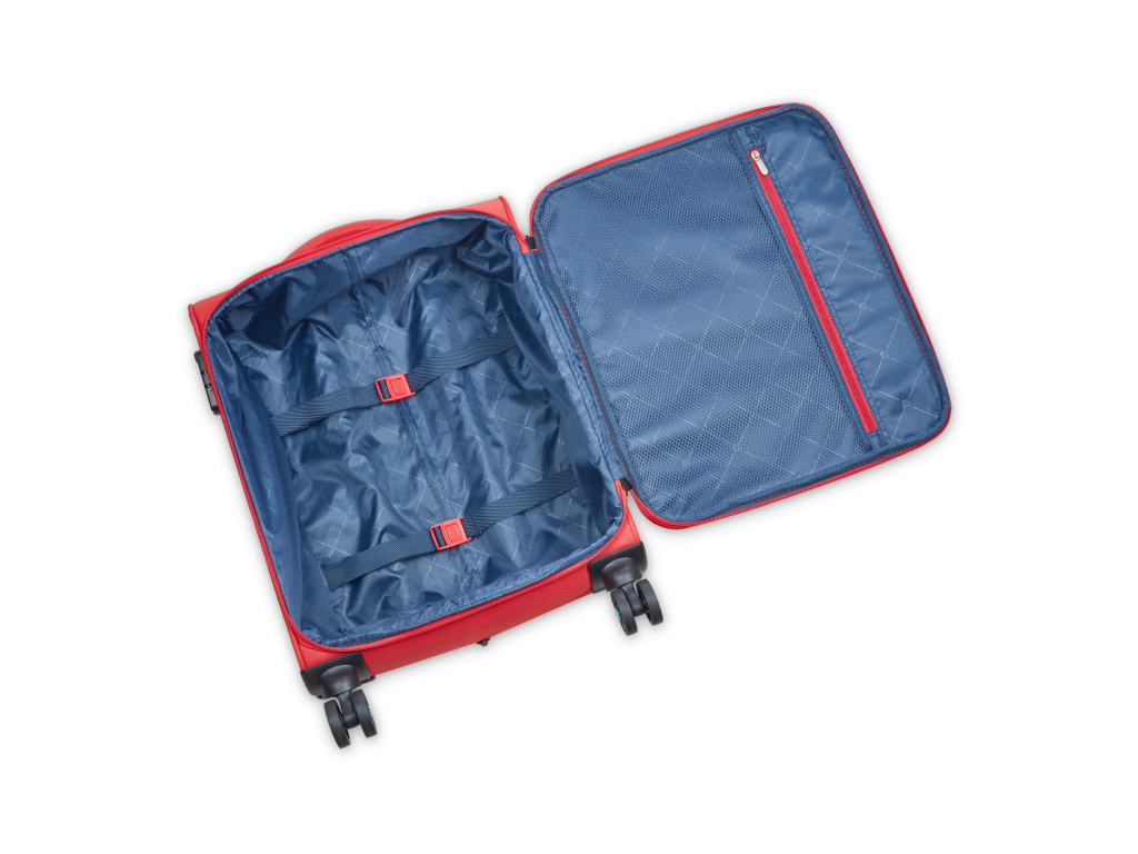 Vnitřek kufru je vybaven stahovacími popruhy a velkou kapsou na zip.