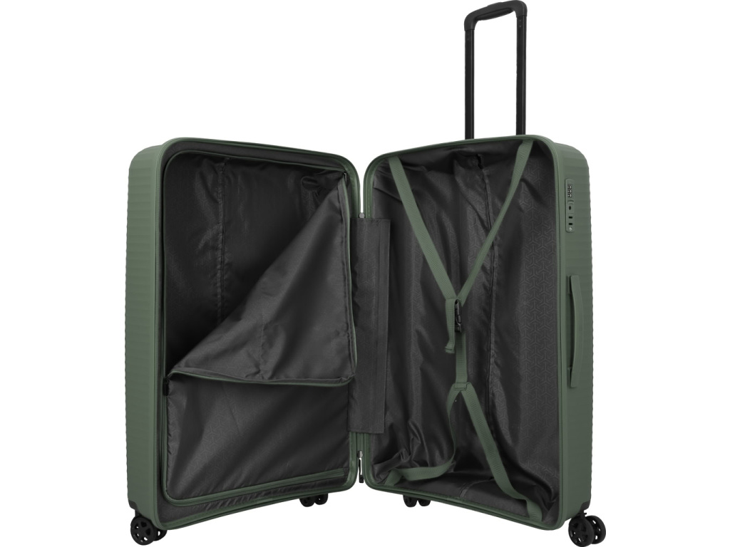Všechny velikosti kufrů jsou vybaveny integrovaným zámkem pro větší bezpečnost. Interiér nabízí dostatek prostoru a praktické organizační prvky pro přehledné uspořádání věcí.