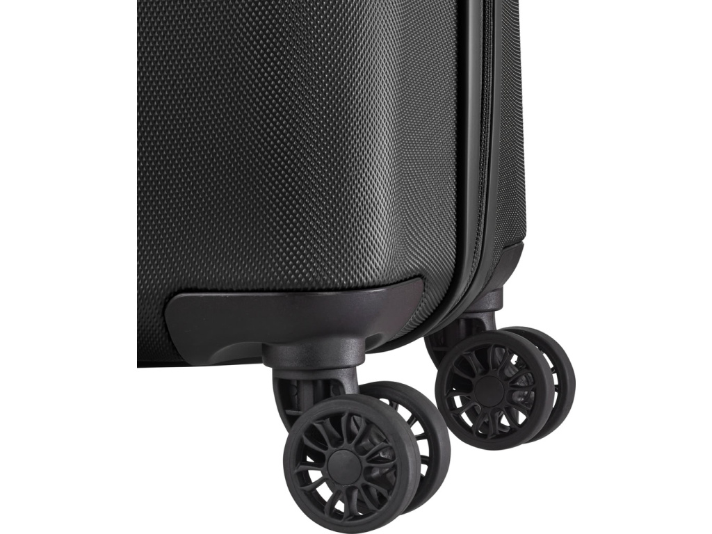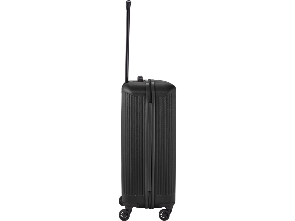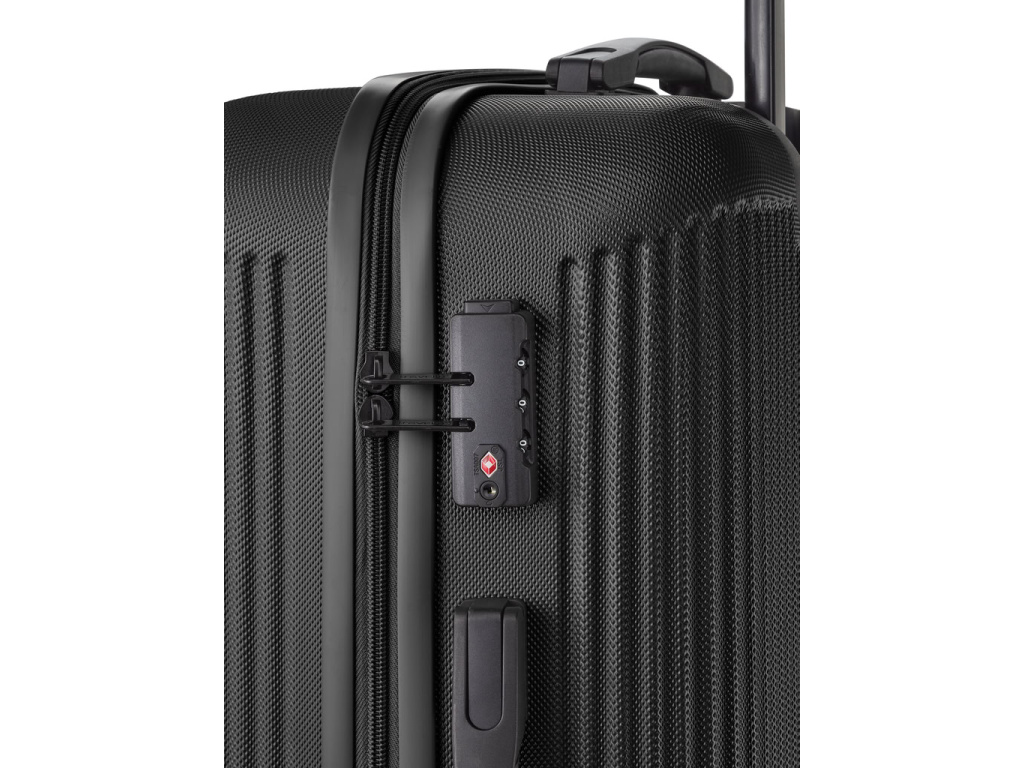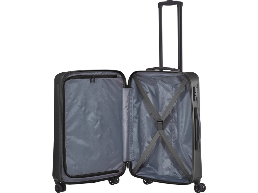 Jednoduše navržený interiér s látkovou příčkou a popruhy pomůže rychle a přehledně sbalit vše potřebné na delší cesty i kratší pobyt mimo domov. Skořepina z odolného tvrdého plastu s hrubým povrchem a integrovaný zámek ochrání uložené věci během přepravy. Čtyři kolečka usnadní jízdu v terénu i manipulaci s plně naloženým zavazadlem.