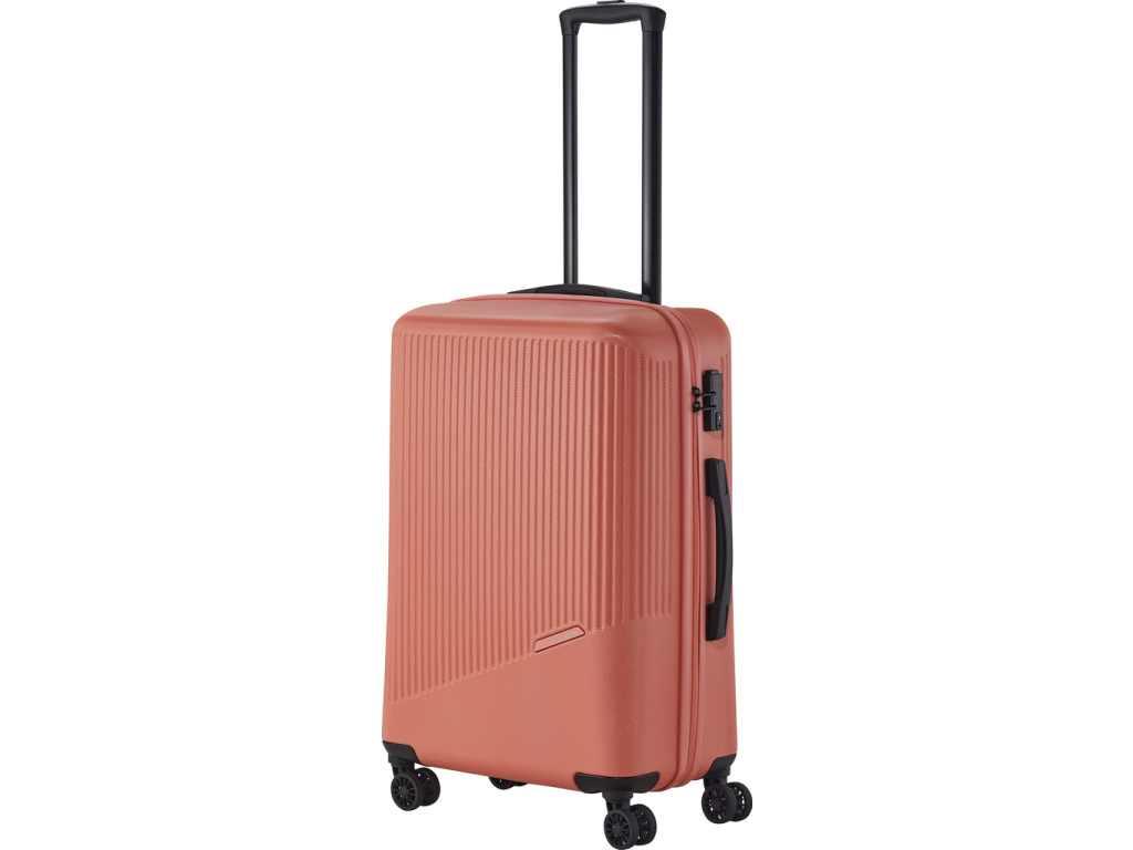 Jednoduše navržený interiér s látkovou příčkou a popruhy pomůže rychle a přehledně sbalit vše potřebné na delší cesty i kratší pobyt mimo domov. Skořepina z odolného tvrdého plastu s hrubým povrchem a integrovaný zámek ochrání uložené věci během přepravy. Čtyři kolečka usnadní jízdu v terénu i manipulaci s plně naloženým zavazadlem.