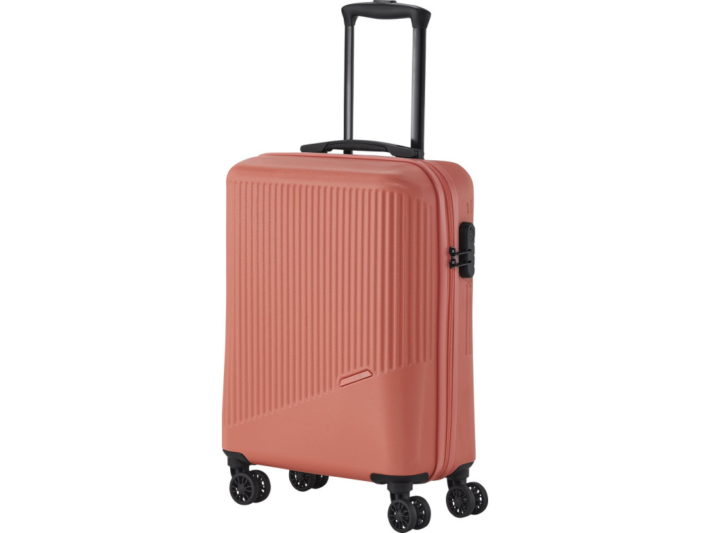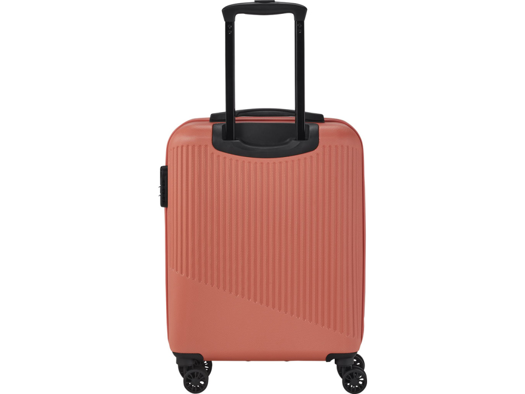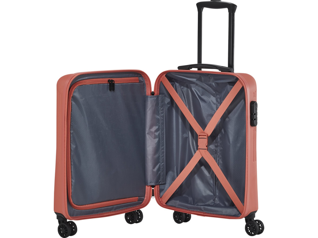 Jednoduše navržený interiér s látkovou příčkou a popruhy pomůže rychle a přehledně sbalit vše potřebné na delší cesty i kratší pobyt mimo domov. Skořepina z odolného tvrdého plastu s hrubým povrchem a integrovaný zámek ochrání uložené věci během přepravy. Čtyři kolečka usnadní jízdu v terénu i manipulaci s plně naloženým zavazadlem.