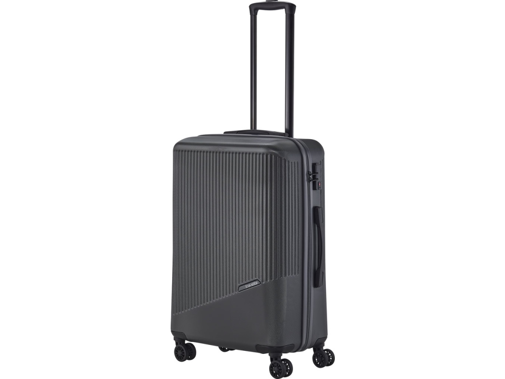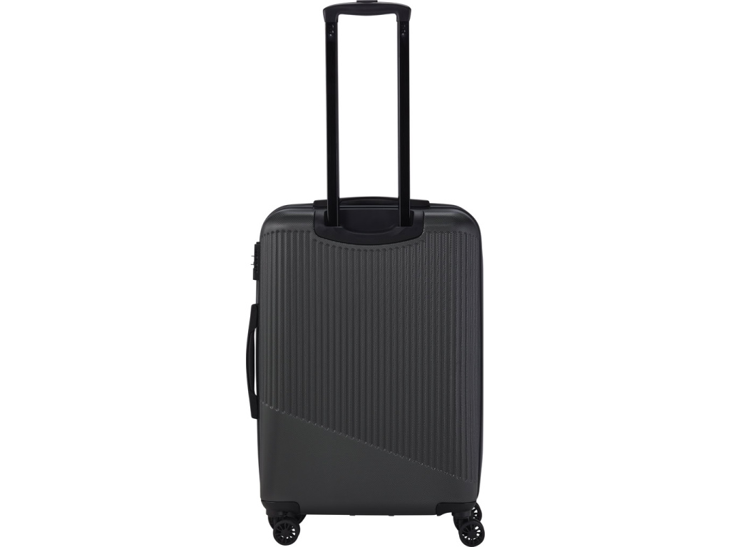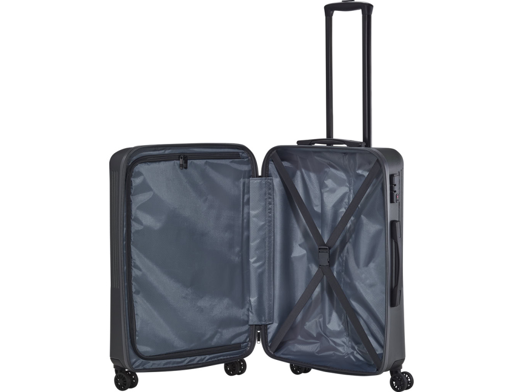 Jednoduše navržený interiér s látkovou příčkou a popruhy pomůže rychle a přehledně sbalit vše potřebné na delší cesty i kratší pobyt mimo domov. Skořepina z odolného tvrdého plastu s hrubým povrchem a integrovaný zámek ochrání uložené věci během přepravy. Čtyři kolečka usnadní jízdu v terénu i manipulaci s plně naloženým zavazadlem.