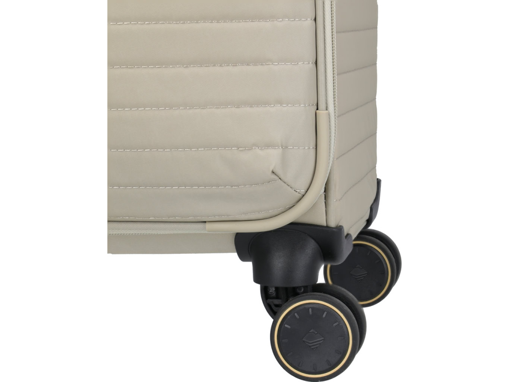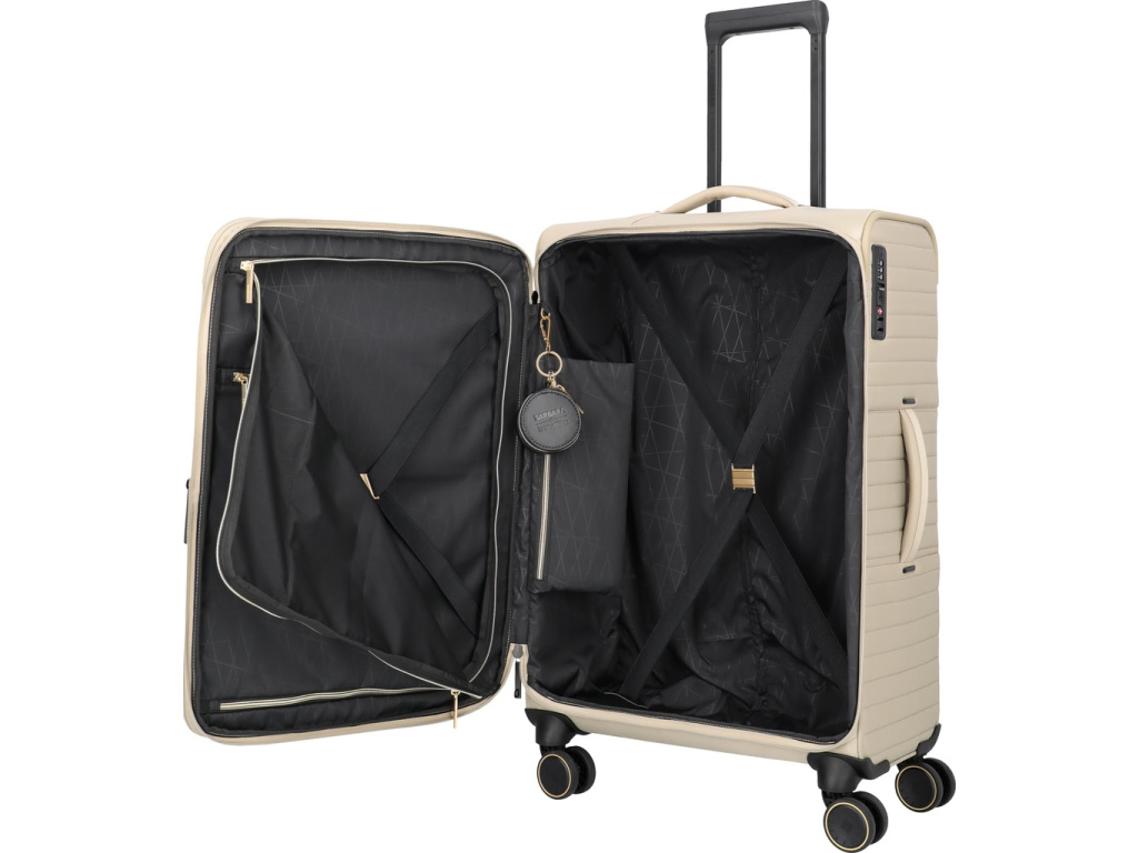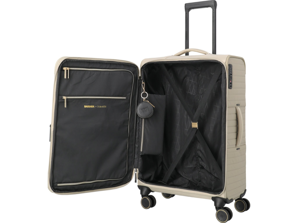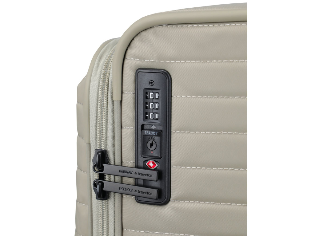 Střední kufr z kolekce BARBARA & travelite Stepp kombinuje elegantní design z recyklovaného nylonu s kovovými detaily a integrovaným TSA zámkem pro maximální bezpečí. Promyšlený interiér s kapsami na zip, odděleným vakem na boty či prádlo a vyjímatelnou šperkovnicí udrží vaše věci dokonale uspořádané. Díky rozšiřitelnému objemu se kufr flexibilně přizpůsobí každé cestě – stylově, pohodlně a bez omezení.