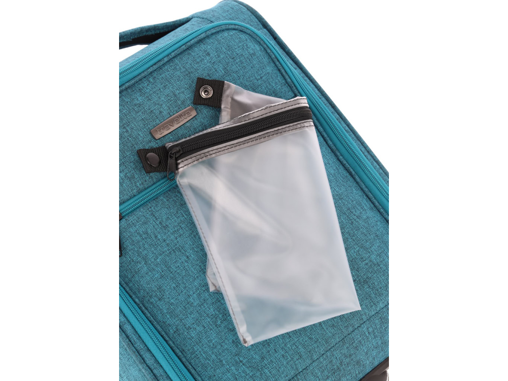 Kompaktní textilní kufr na dvou kolečkách, který splňuje normy pro palubní zavazadla většiny leteckých společností včetně Ryanair a Wizz Air.