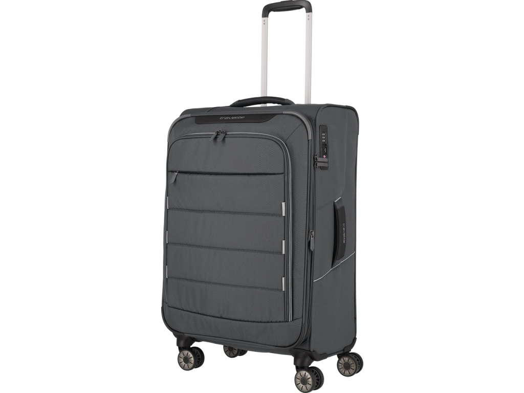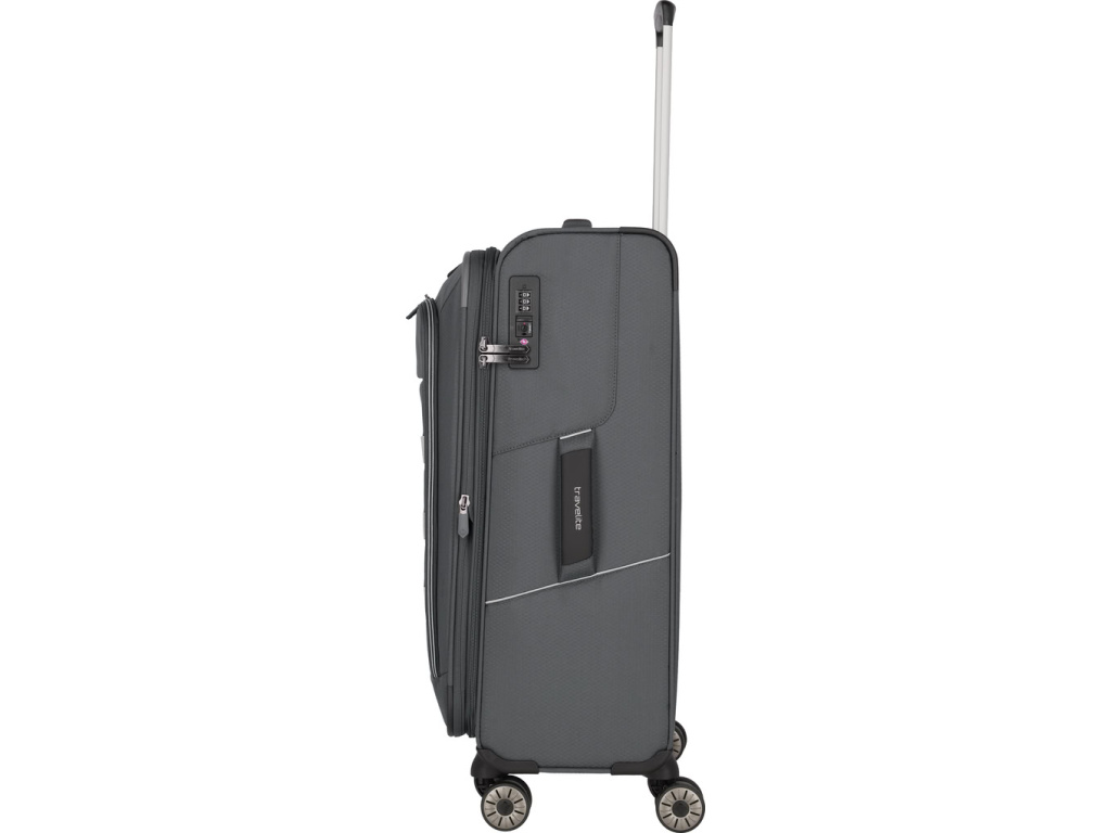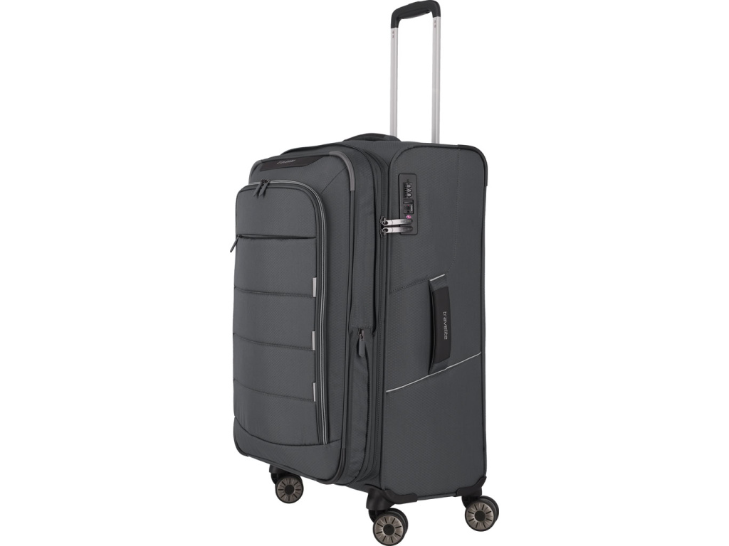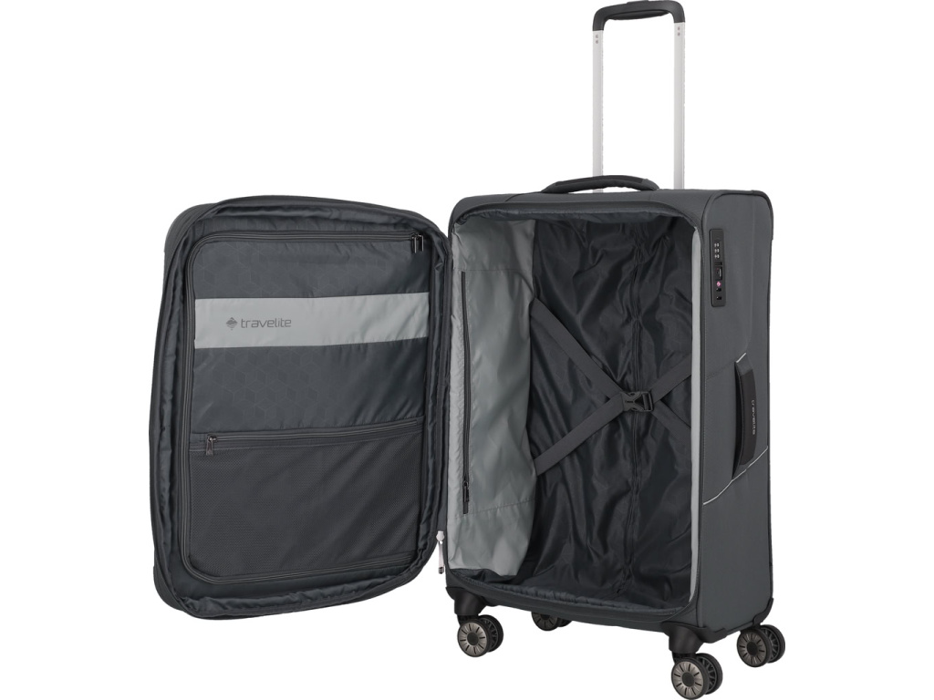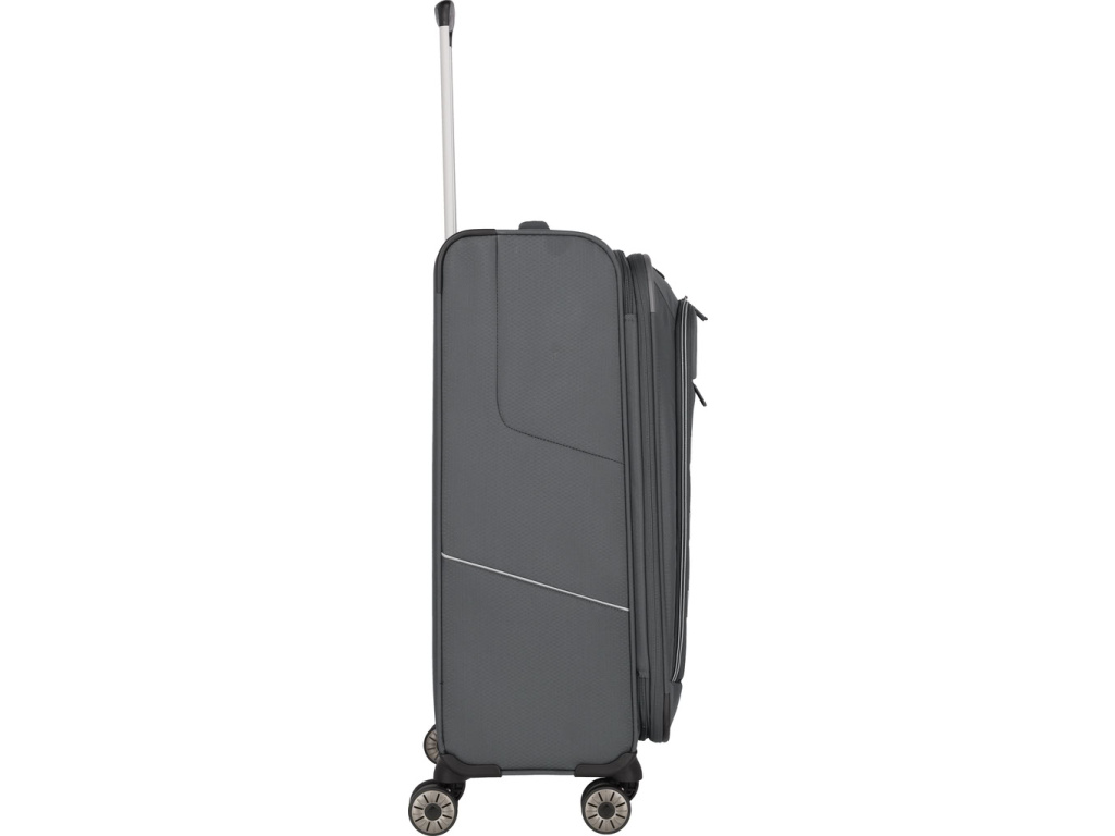 Extra lehký textilní kufr na čtyřech kolečkách s integrovaným TSA zámkem a expandérem vyrobený z recyklovaného polyesteru.