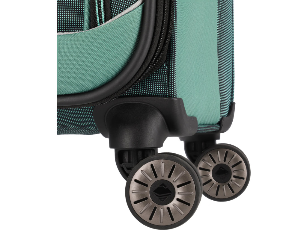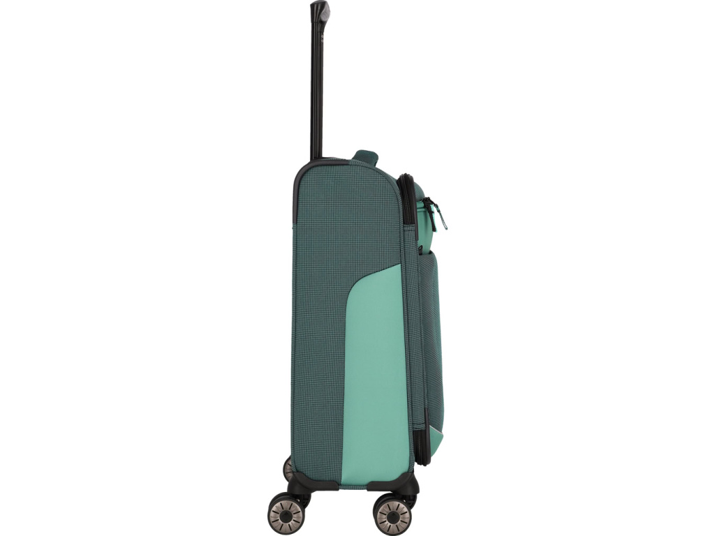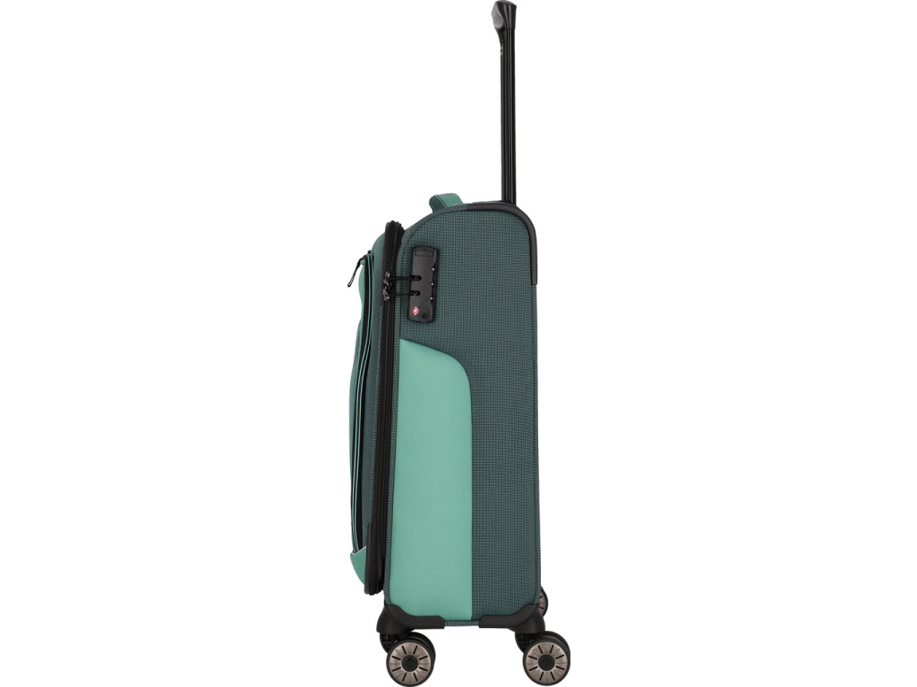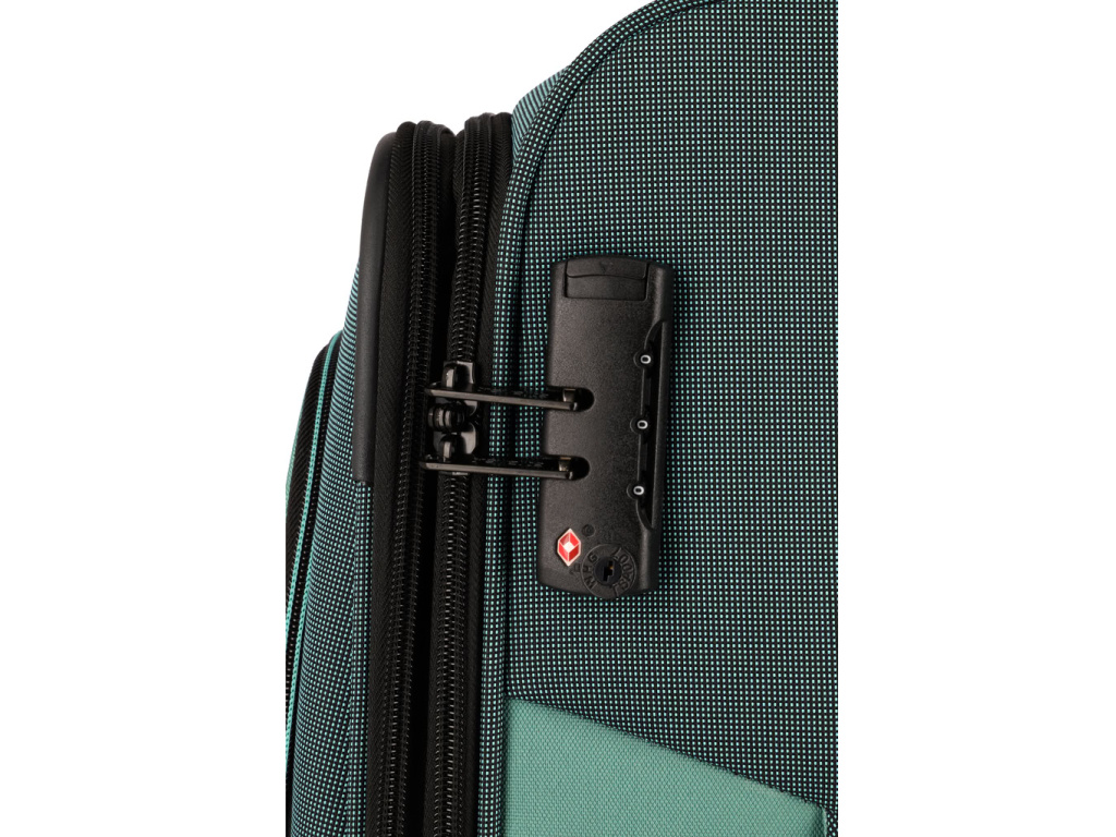 Textilní kufr na čtyřech kolečkách s integrovaným TSA zámkem vyrobený z recyklovaného polyesteru.