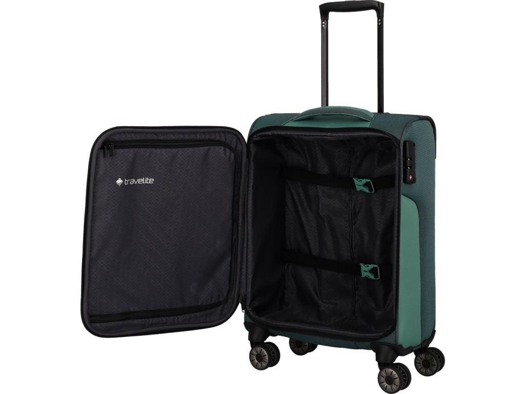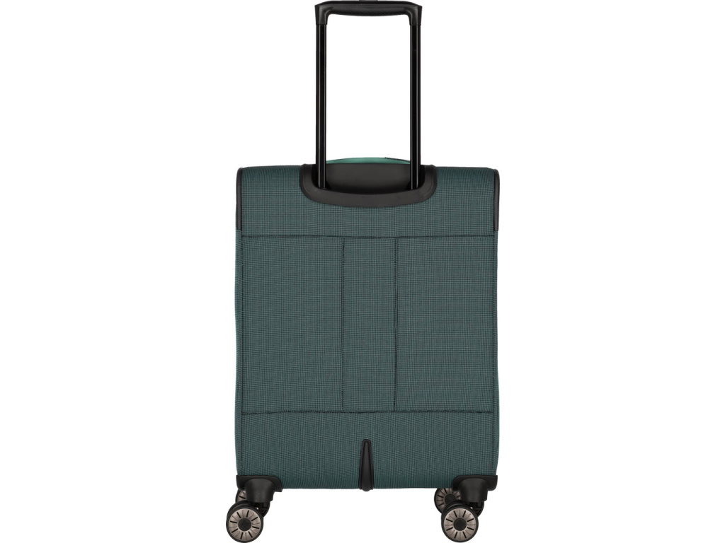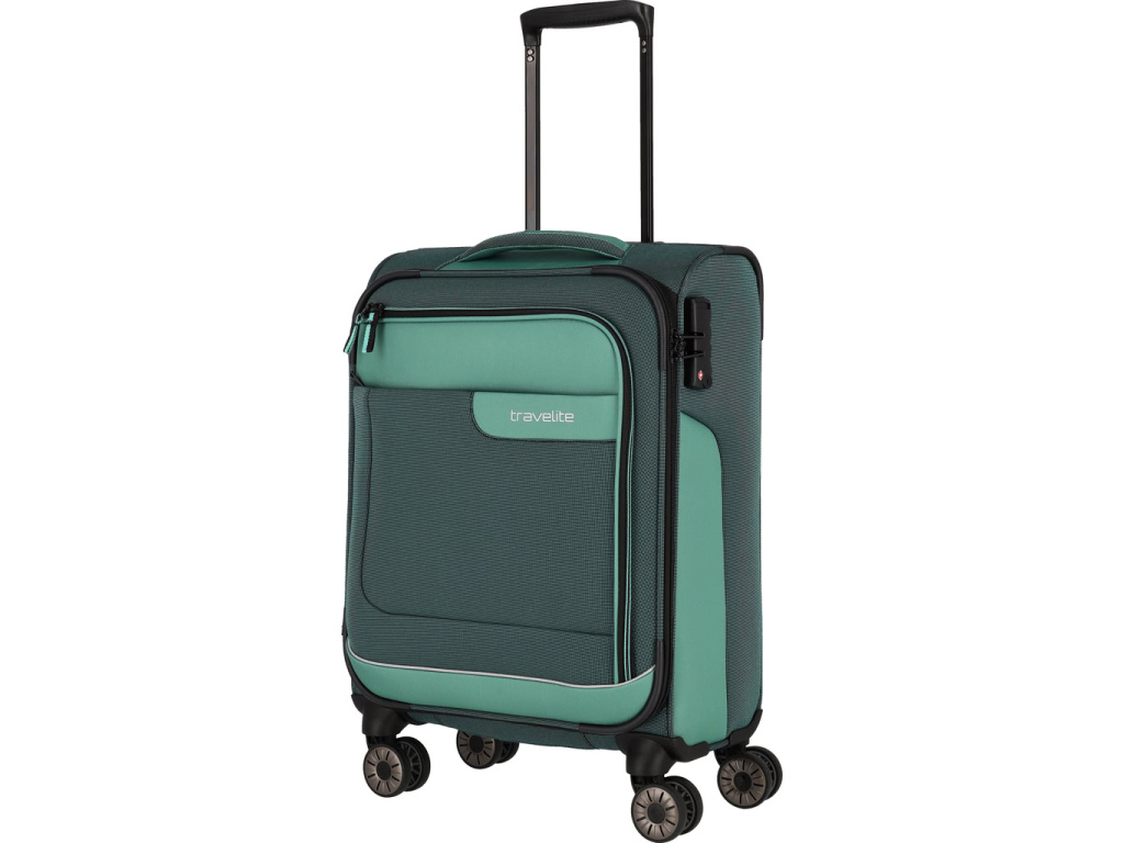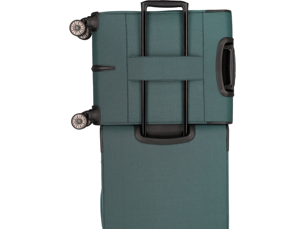 Textilní kufr na čtyřech kolečkách s integrovaným TSA zámkem vyrobený z recyklovaného polyesteru.