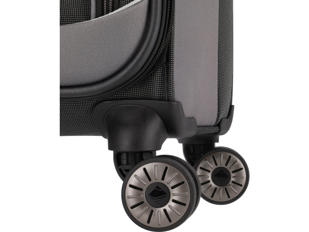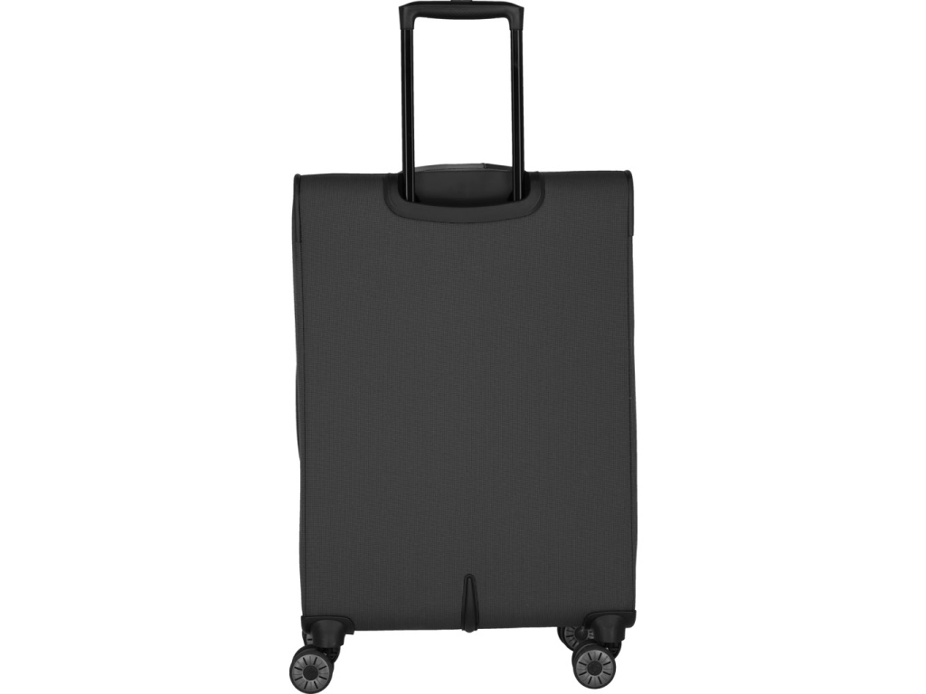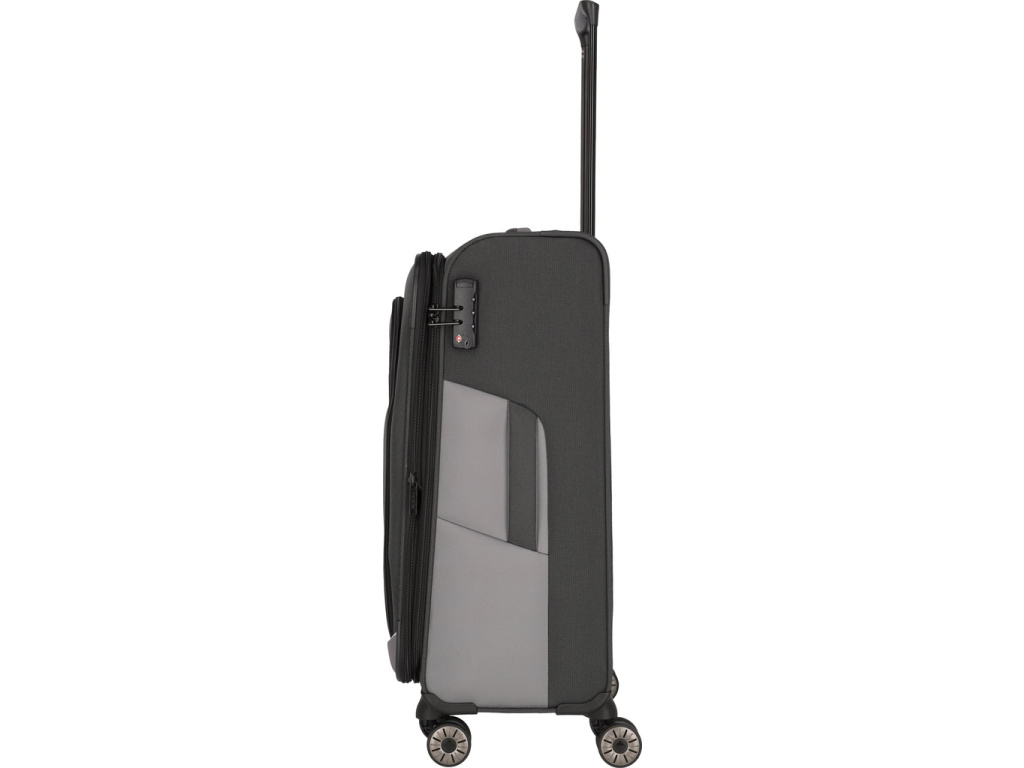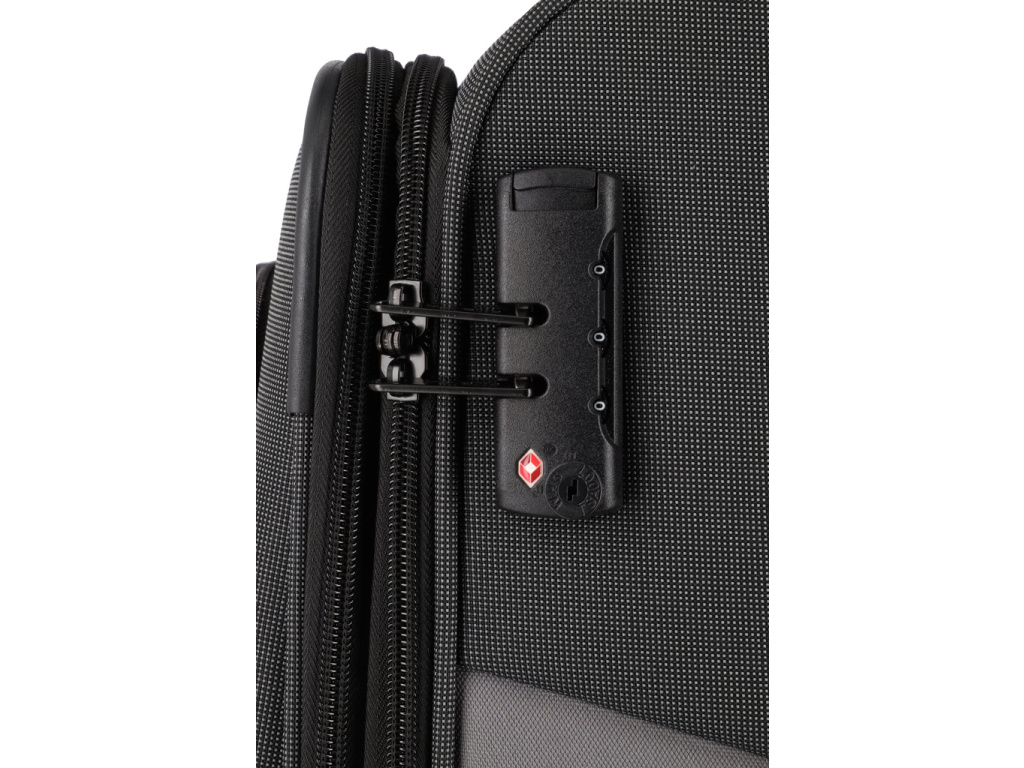 Textilní kufr na čtyřech kolečkách s integrovaným TSA zámkem vyrobený z recyklovaného polyesteru.