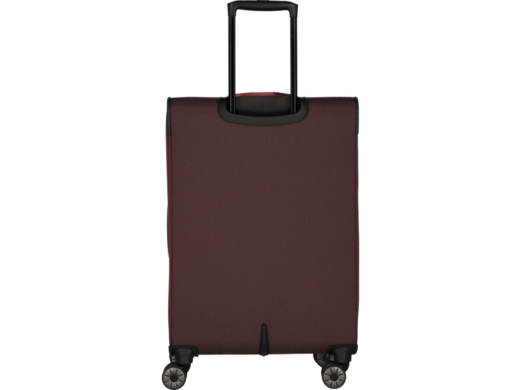 Textilní kufr na čtyřech kolečkách s integrovaným TSA zámkem a expandérem vyrobený z recyklovaného polyesteru.