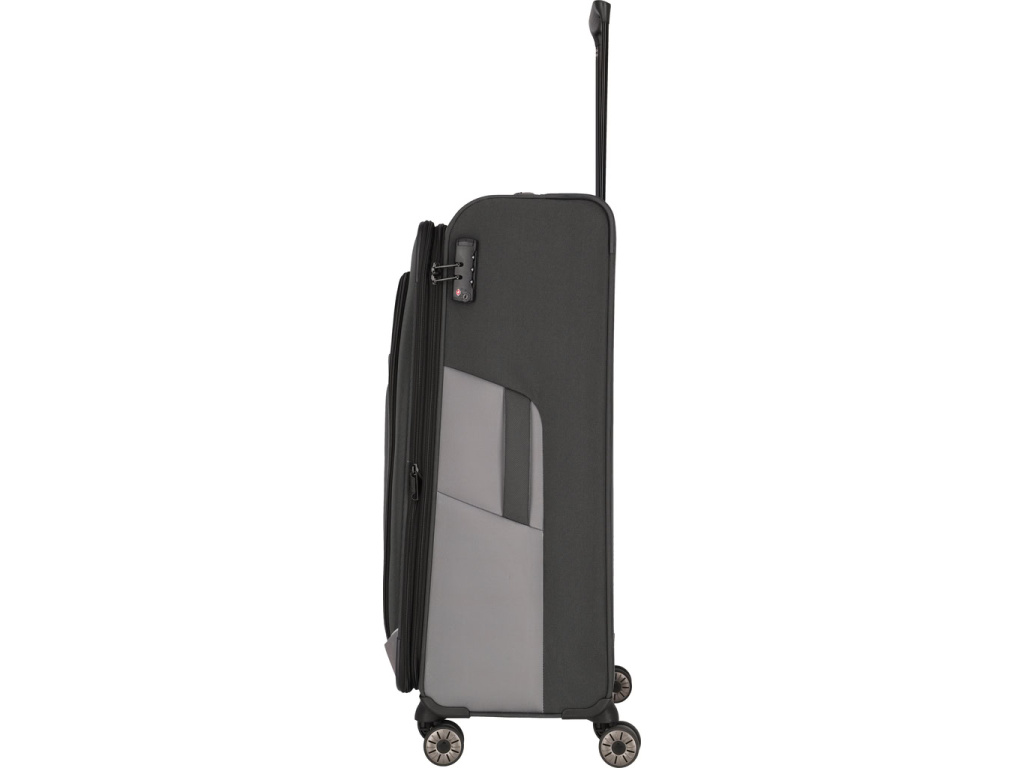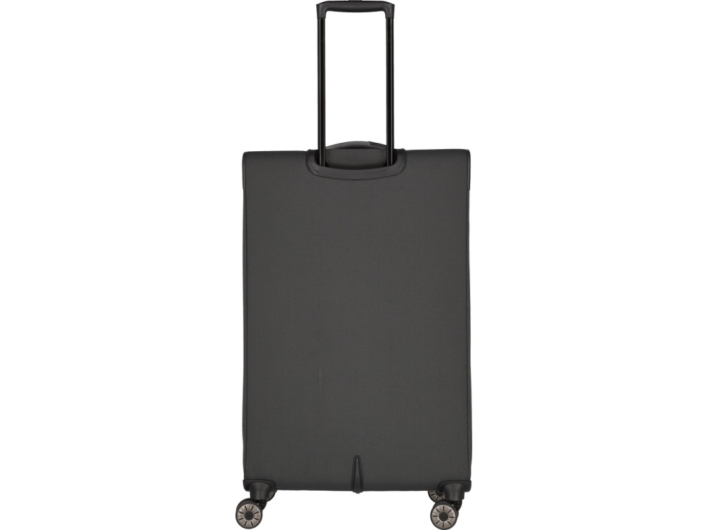 Textilní kufr na čtyřech kolečkách s integrovaným TSA zámkem vyrobený z recyklovaného polyesteru.