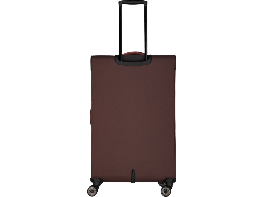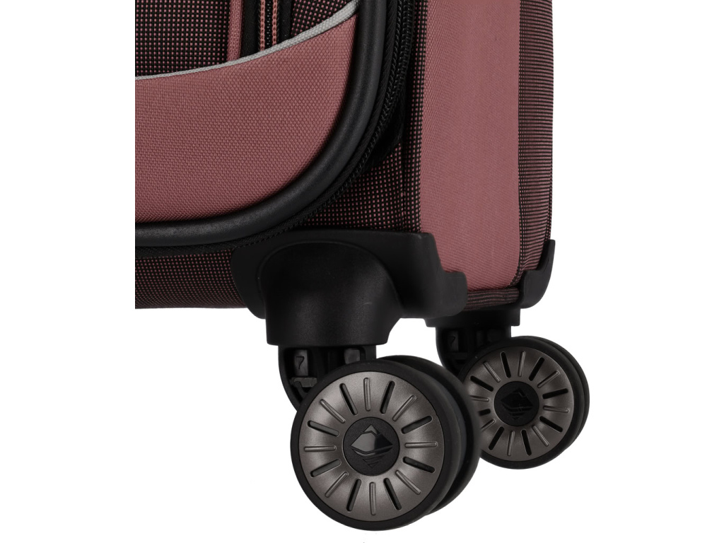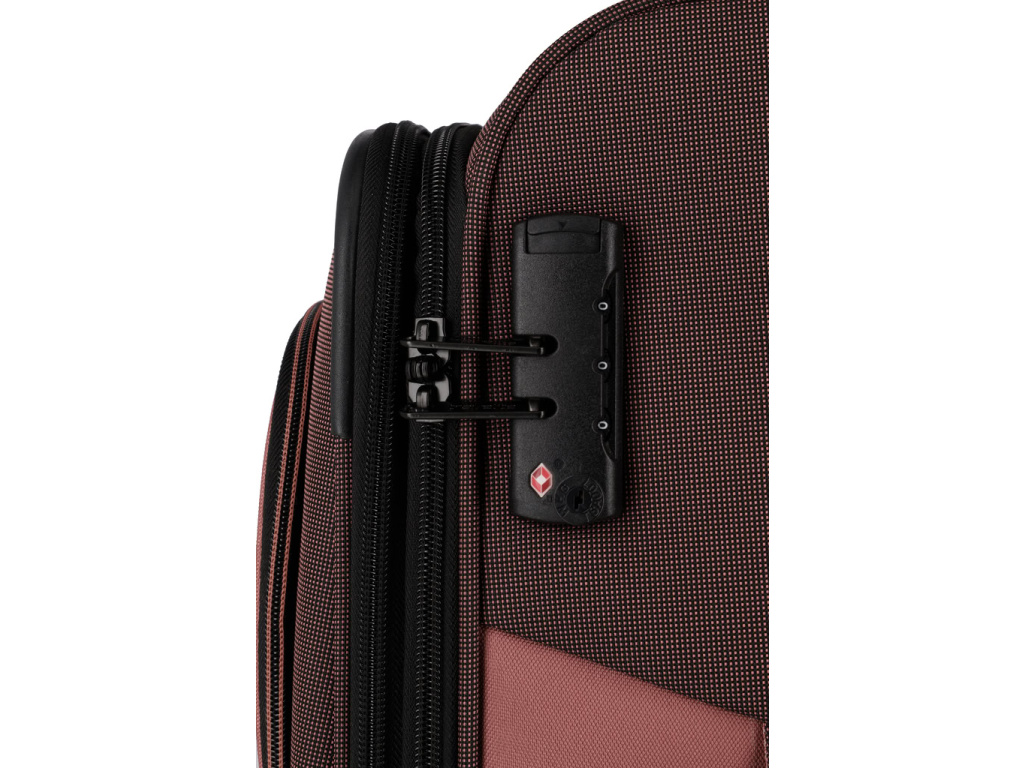 Textilní kufr na čtyřech kolečkách s integrovaným TSA zámkem vyrobený z recyklovaného polyesteru.